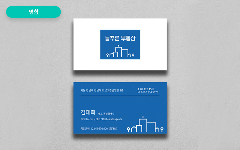 간판, 사업자 등록증, 업체명과 로고가 확인되는 웹페이지, 명함, 전단지