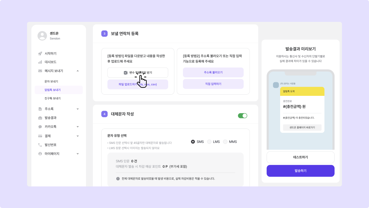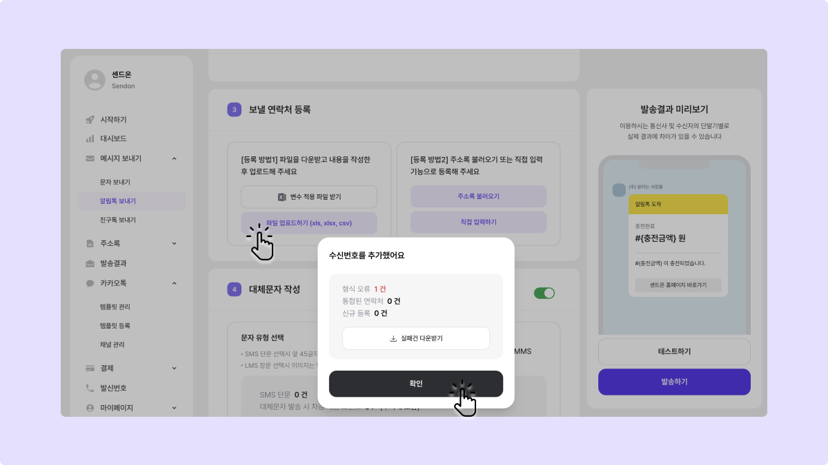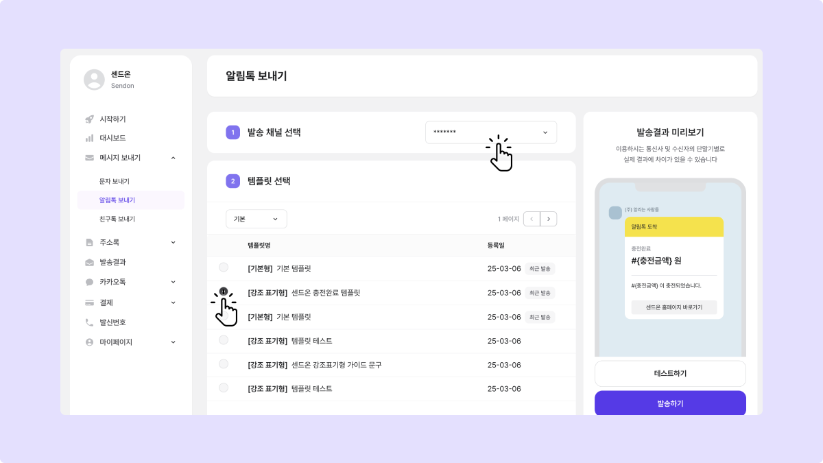 센드온은 발송하기를 누르는 순간 순식간에 <mark style="color:red;background-color:yellow;">수신자에게 발송되고, 취소가 불가하니 발송 전 내용을 꼭 점검</mark>해주세요.