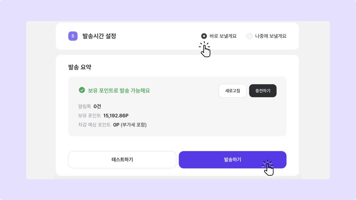 ※ 테스트 발송은 건당 포인트가 동일하게 차감되니 참고해주세요!&#x20;
