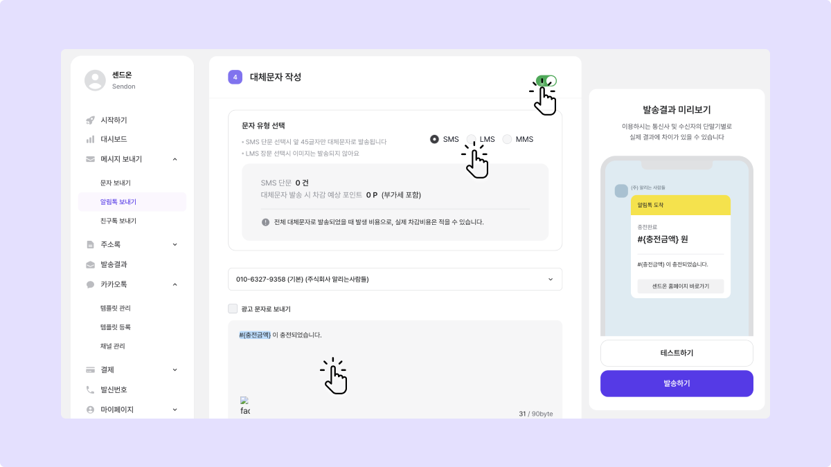 알림톡 발송에 실패할 경우(예를 들어 알림톡을 차단했거나 사용하지 않는 수신자의 경우) 대체문자를 발송할 수 있도록 설정할 수 있어요.&#x20;