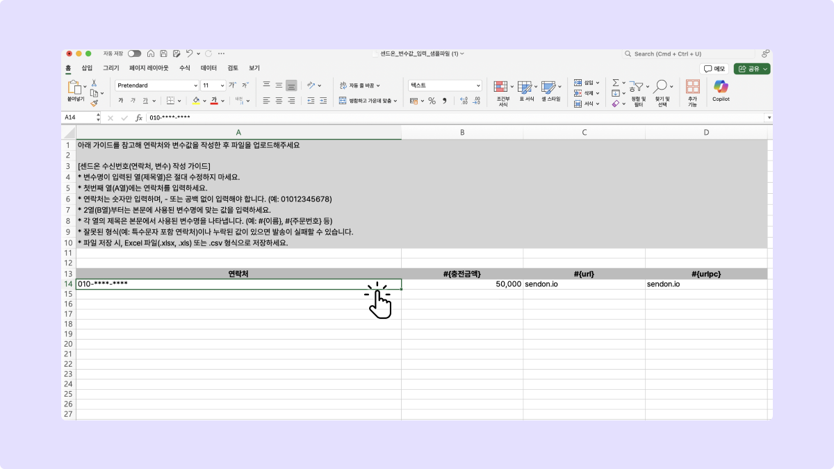 <figure><img src="https://1110439346-files.gitbook.io/~/files/v0/b/gitbook-x-prod.appspot.com/o/spaces%2F6pw8H9olRTkFFZrnyx0c%2Fuploads%2Fi6mq7bgVwzytVyEP1THk%2F%E1%84%87%E1%85%A7%E1%86%AB%E1%84%89%E1%85%AE%E1%84%91%E1%85%A1%E1%84%8B%E1%85%B5%E1%86%AF%20%E1%84%83%E1%85%A1%E1%84%8B%E1%85%AE%E1%86%AB%E1%84%87%E1%85%A1%E1%86%AE%E1%84%8B%E1%85%A1%20%E1%84%89%E1%85%A5%E1%86%AF%E1%84%8C%E1%85%A5%E1%86%BC%E1%84%92%E1%85%A1%E1%84%80%E1%85%B5-1.png?alt=media&#x26;token=f4b36790-6bb1-4e21-9bc7-89d1af112965" alt=""><figcaption><p>연락처를 입력한 열은 모든 변수값이 입력되어야해요.</p></figcaption></figure>