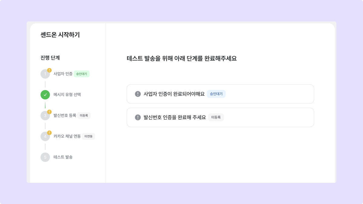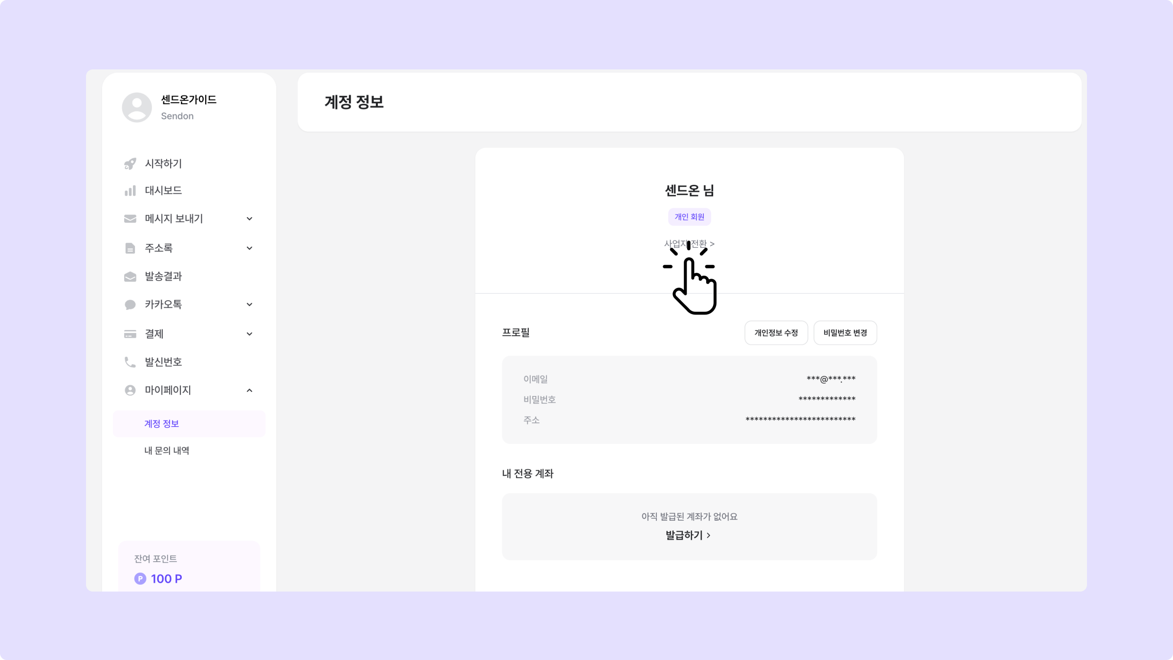 [<mark style="color:purple;background-color:purple;">계정정보</mark>](https://console.sendon.io/page/mypage)에서 사업자 전환을 시도해주세요. 😃
