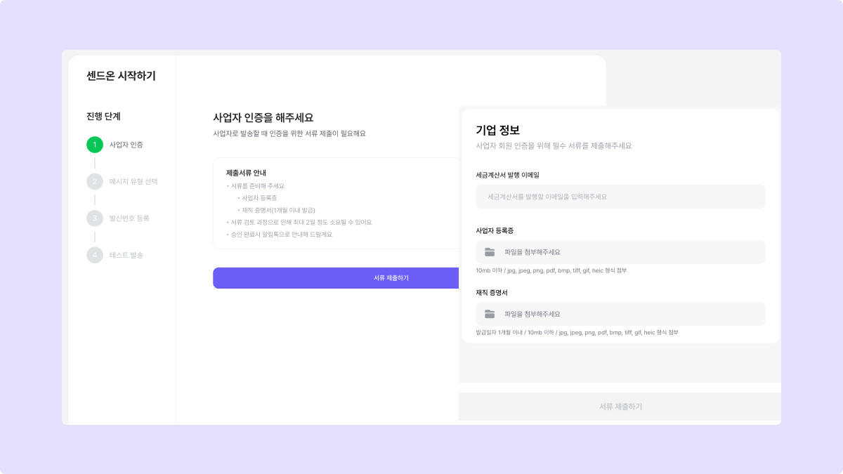 ## [시작하기](https://console.sendon.io/page/onboarding)에서 서류 제출하기
