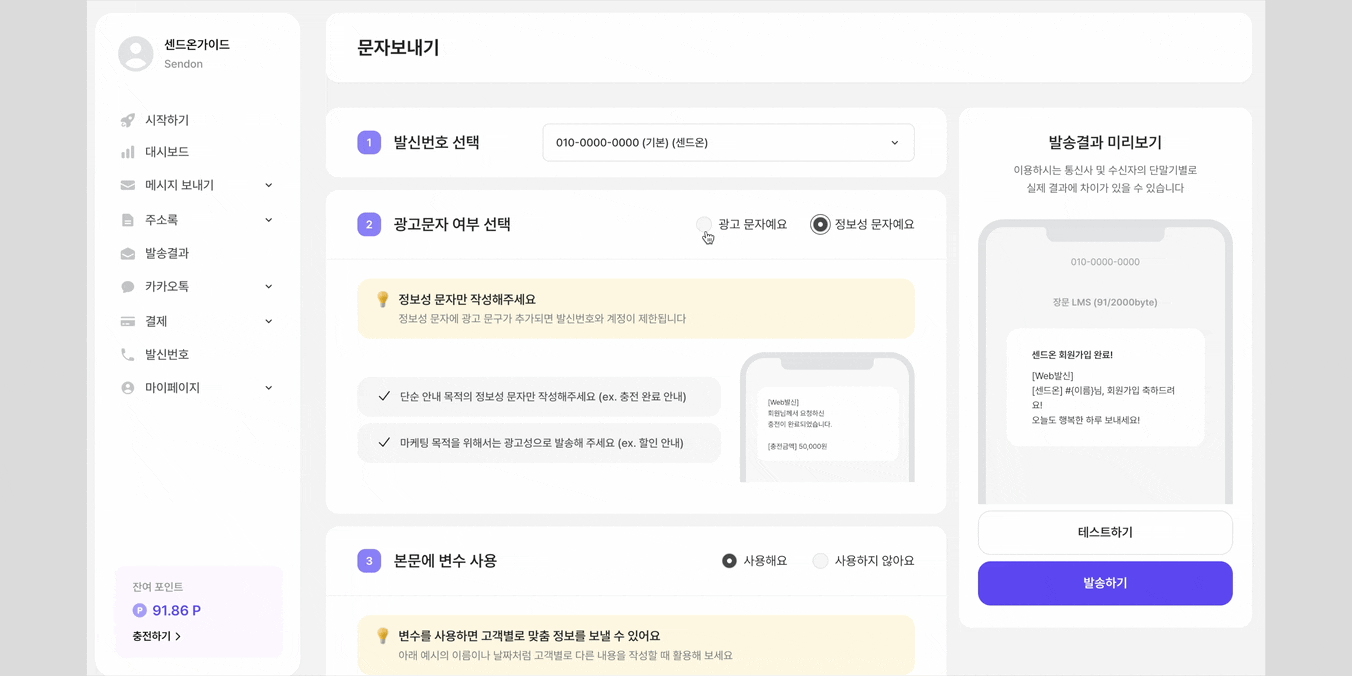 발신번호 등록과 충전까지 완료했다면 이제 문자를 보낼 수 있어요. 누구나 쉽게 보낼 수 있도록 구성했지만, 한 번 훑어보시면 훨씬 수월하게 시작할 수 있어요.